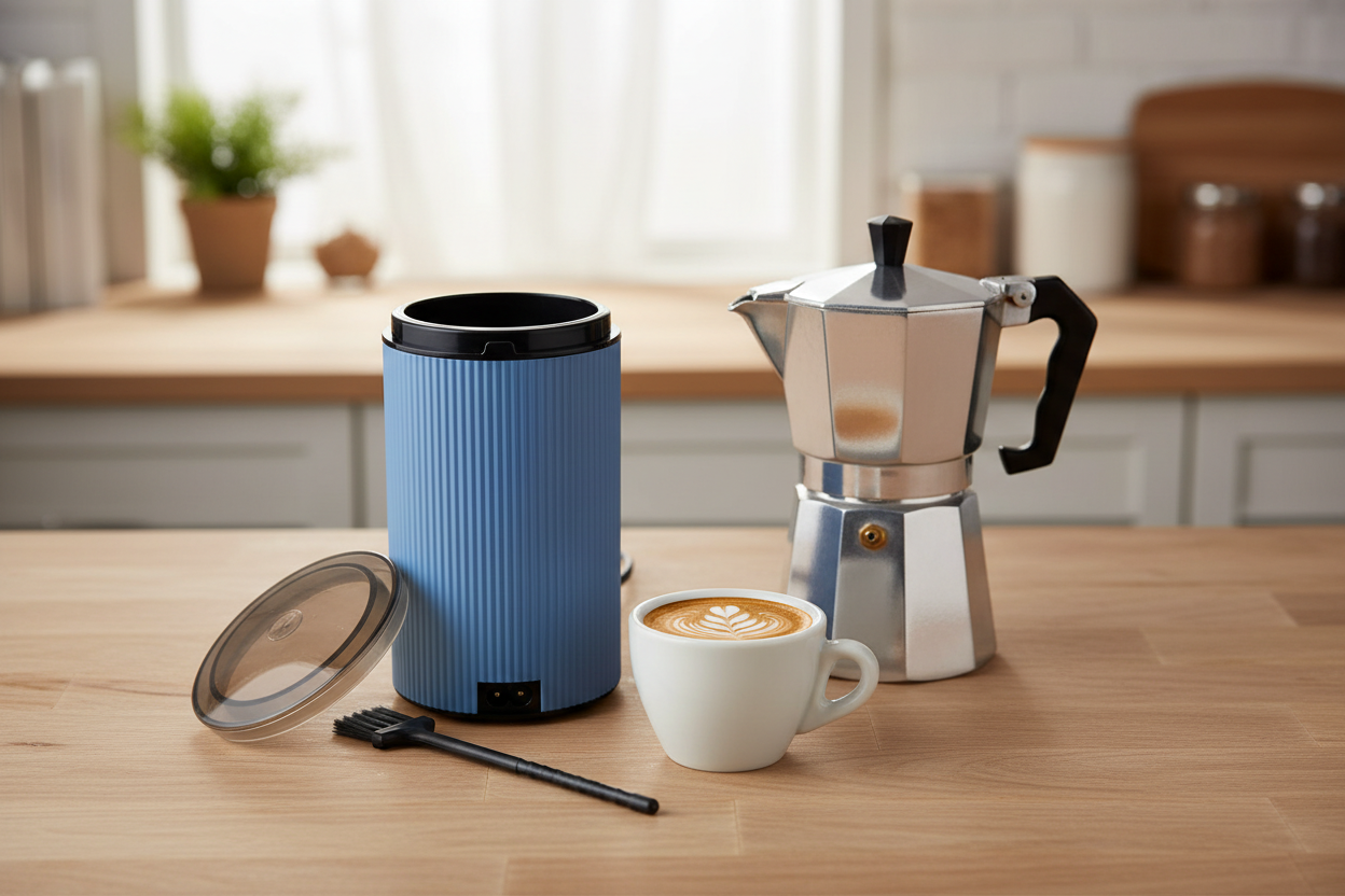 Es compacto, eléctrico y directo: café en grano dentro, tapa, pulsas… y en segundos tienes tu molienda lista para cafetera italiana, espresso básico o filtro.
